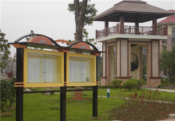 木材的宣傳欄多用在園林中,這種宣傳欄不太實(shí)用,一般只能張貼戶外寫真畫面。由于木質(zhì)的宣傳欄不能把內(nèi)容藏于玻璃內(nèi)部,只能裸露在外面,所以內(nèi)容得不到保護(hù)。